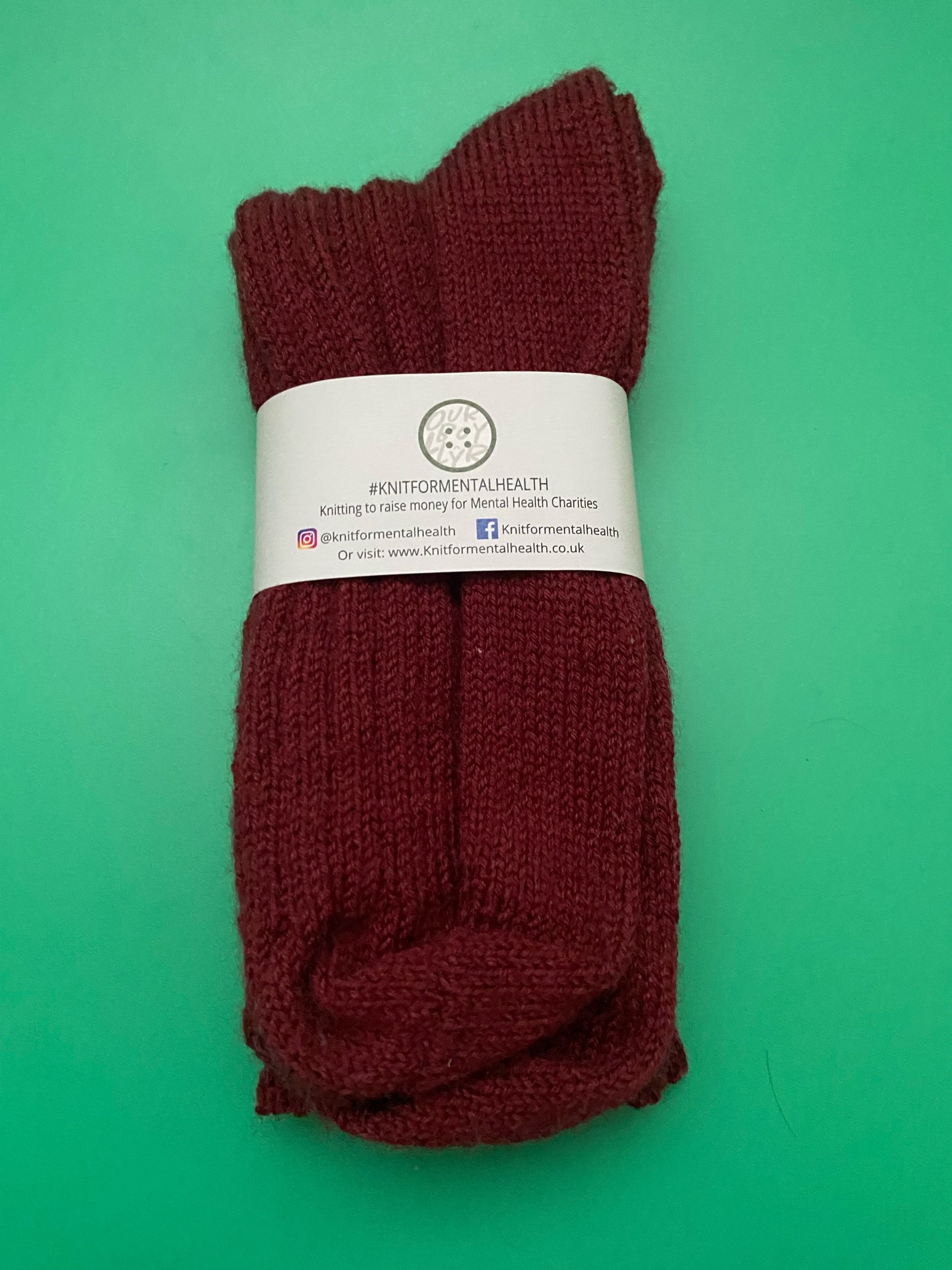 Size 10 Hand Knitted Socks In Wine 75% Wool 25% Acrylic